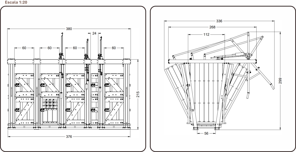O formato em “V” das laterais favorece o correto posicionamento do animal e contribui para reduzir o estresse durante a contenção. O sistema de travas automáticas, as 16 portas laterais e as 03 portas de correr tornam o manejo mais ágil e prático em diferentes rotinas de campo.